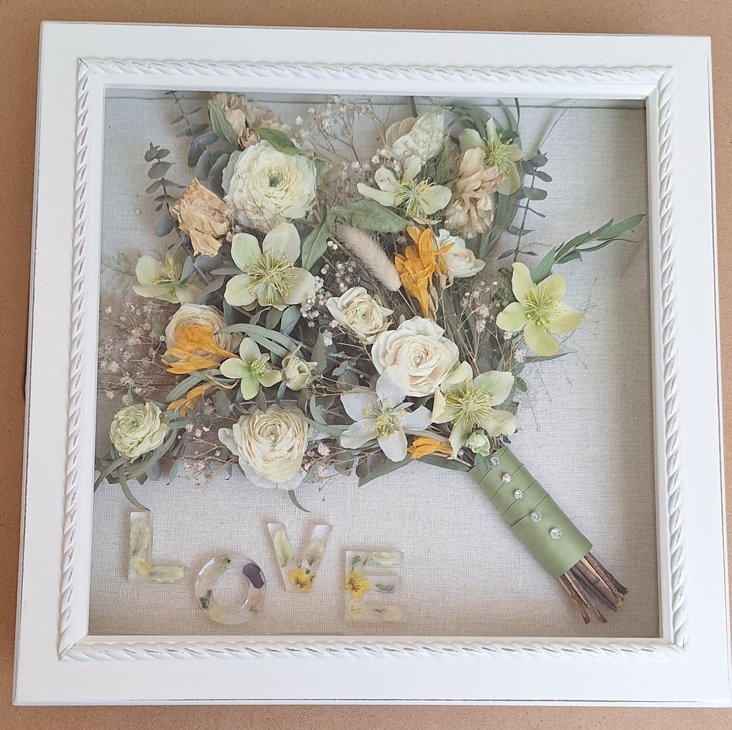 Personalise your piece with keepsakes like lace, jewellery, or invitations for a one-of-a-kind floral heirloom that captures the heart of your moment.
