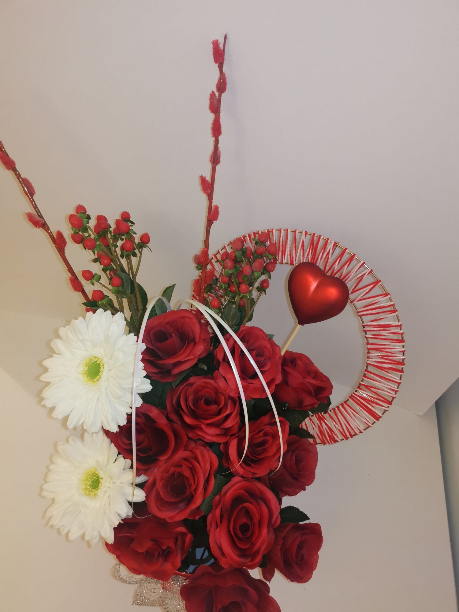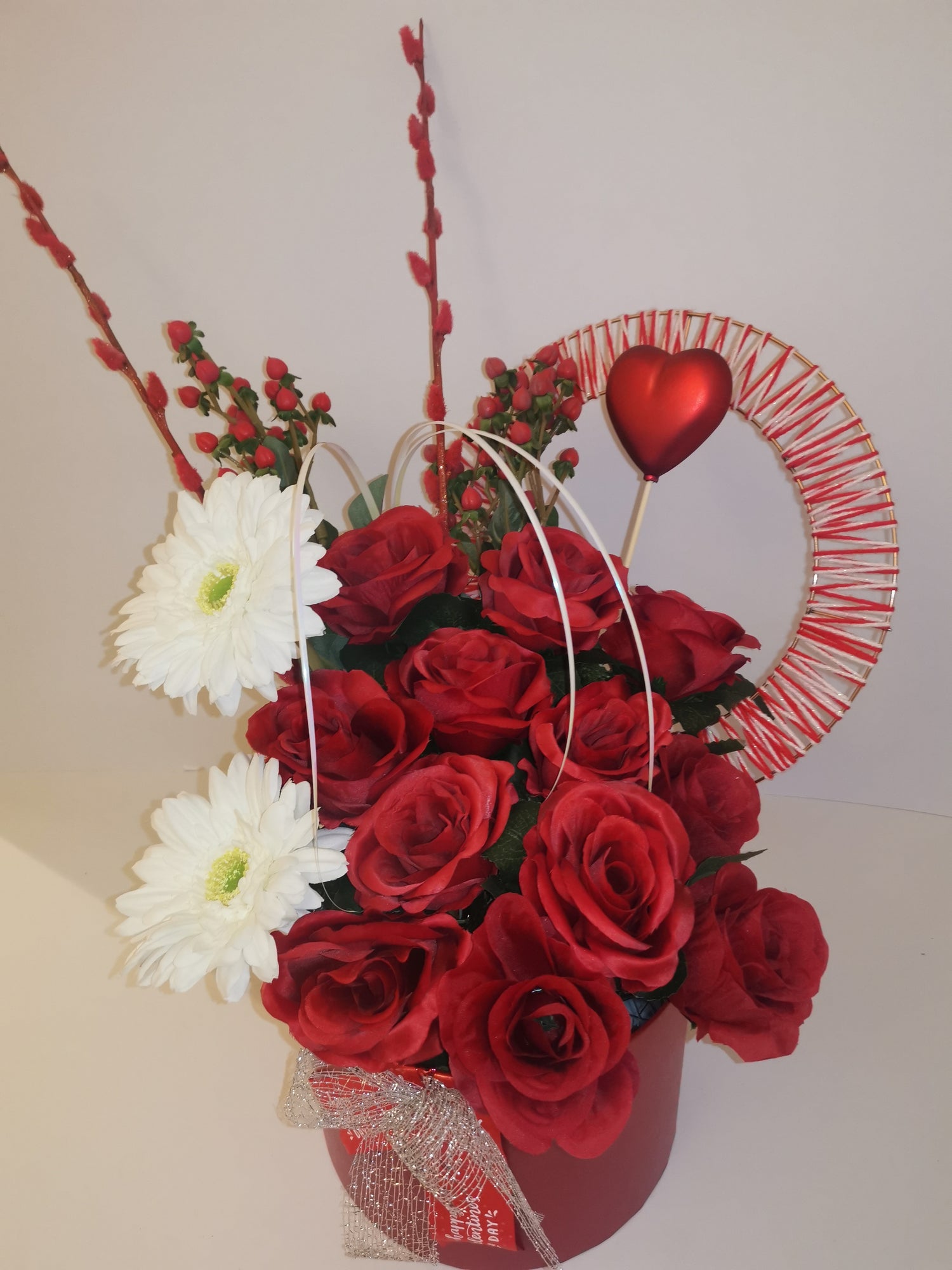 Dozen red roses, gerberas and seasonal foliage will communicate your love and desire to your loved one make them feel extra special, all design in luxury hat box.