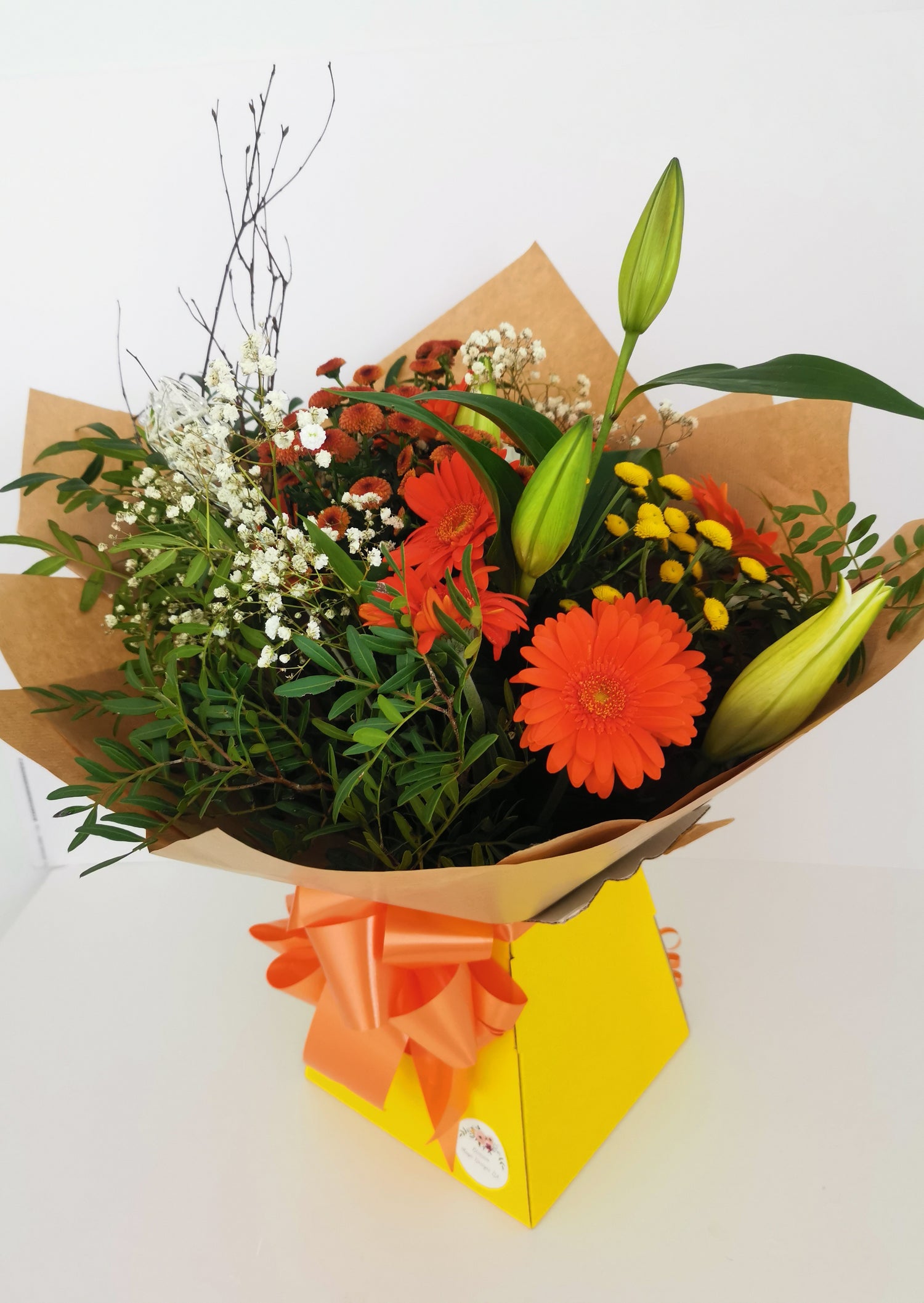Hand tied aqua bouquet with orange gerberas, lili, chrisantamas and foliage arranged in luxury box.